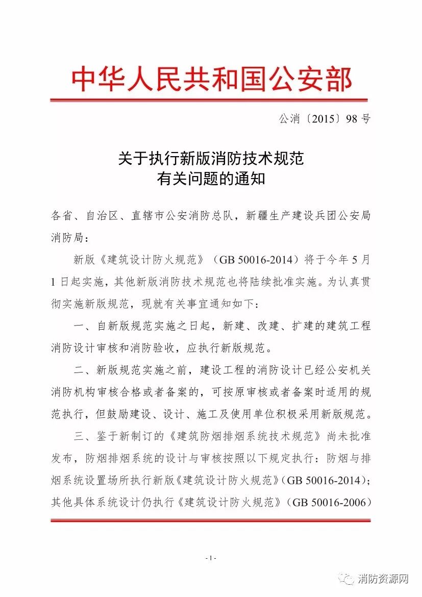 新版《建筑设计防火规范》(GB50016-2014)将于今年5月1日起实施,其他新版消防技术规范也将陆续批准实施。为认真贯彻实施新版规范,现就有关事宜通知如下:
