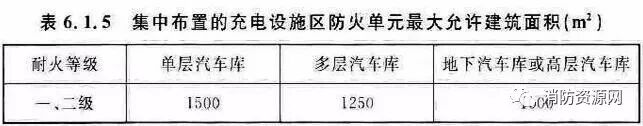 根据《电动汽车分散充电设施工程技术标准》(GB/T51313-2018)要求,新建汽车库内配建的分散充电设施在同一防火分区内应集中布置,应设置独立的防火单元,每个防火单元的最大允许建筑面积应符合表6.1.5的规定。