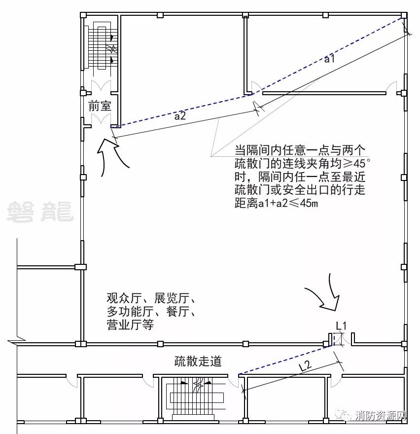 2、当房间内设置隔间时,室内任一点至最近疏散门或安全出口的直线距离应按行走距离计算,当隔间内任意一点与两个疏散门的连线夹角均≥45°时,行走距离可以放宽至45m(即a1+a2≤45m),但隔间内任意一点至最近的疏散门或安全出口的直线距离仍应≤30m(37.5m)