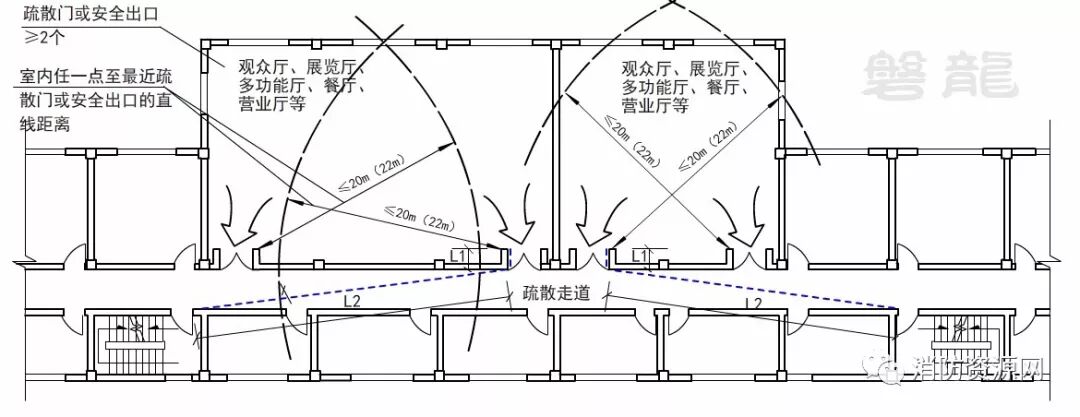 4、当房间室内任一点至最近疏散门或安全出口的直线距离均≤20m(22m)时,位于两个安全出口之间的疏散门,经疏散走道通至最近安全出口的长度可适当放宽,但不应大于40m(50m),即L1+L2≤40m(50m)。如图所示,同一房间的两个疏散门均应满足此要求。