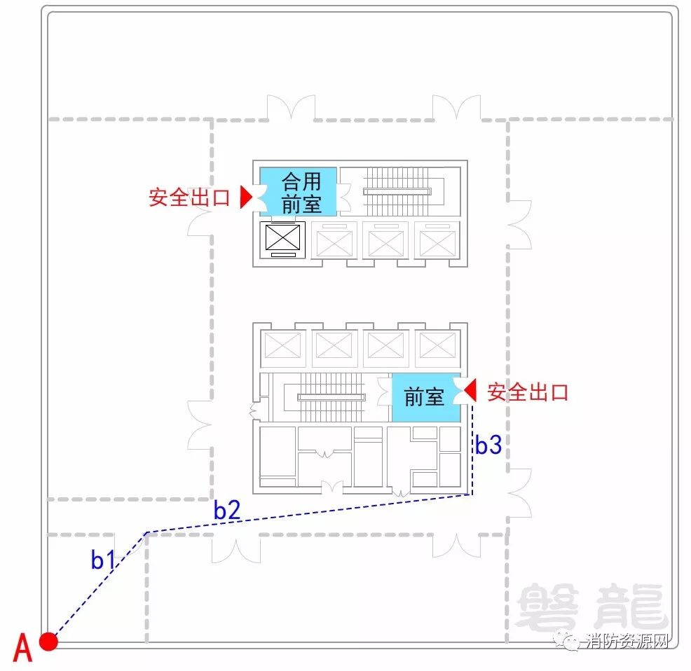 以A点为例,当A点与两个疏散门的连线夹角≥45°时,行走距离不应超过45m(即b1+b2+b3≤45m),否则行走距离不应超过20m(22m),即b1+b2+b3≤20m(22m)