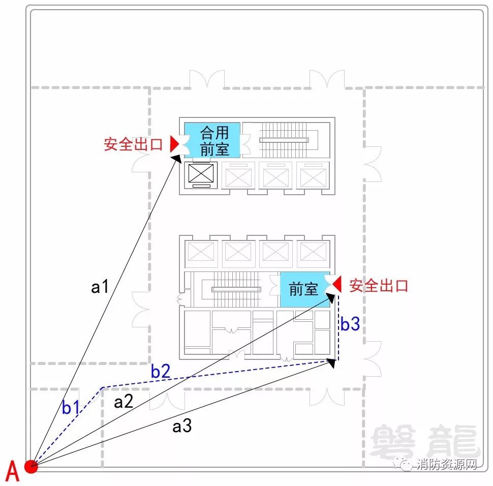 注:有效的疏散门(或安全出口)是指对于某一点可以正常到达和使用的疏散出口。