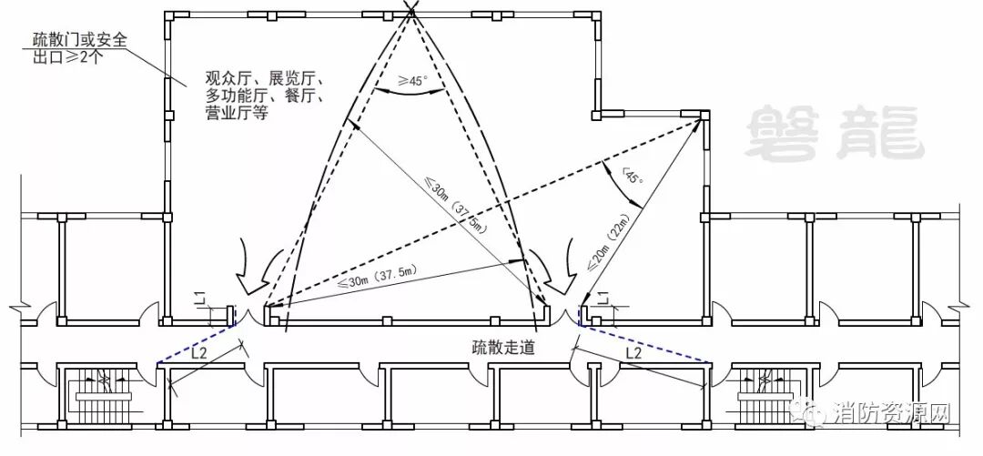 1、当房间内某一点与两个疏散门的连线夹角≥45°时,这一点至最近的疏散门或安全出口的直线距离应≤30m(37.5m)。当某一点与两个疏散门的连线夹角<45°时,这一点至最近的疏散门或安全出口的直线距离应≤20m(22.0m)。
